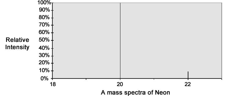 The numbers outputted from a mass spectrometer are usually values of % relative abundance or intensity. For example, in the mass spectra of neon (right), there are three different ions: mass 20, with a relative abundance of 100%; 21, with a relative abundance of 0.3% (so small that it does not even show up on the graph); and 22, with relative abundances of 8.82%.