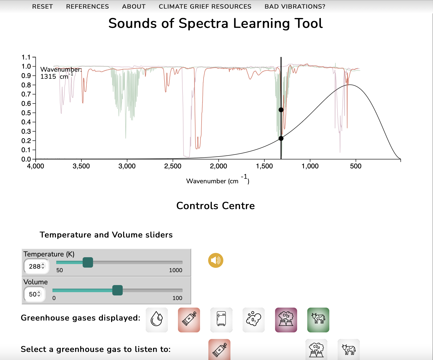This applet allows users to experience the IR spectra of various common greenhouse gases as sound. This allows another dimension of understanding of the fundamental global heating and cooling mechanisms contributing to global climate change. Select various greenhouse gases to display on the IR spectrum and from that group select one to listen to. Slide along the spectra to hear the peaks as sound. The temperature can also be adjusted and its effect on Earth’s black body curve will be observed.